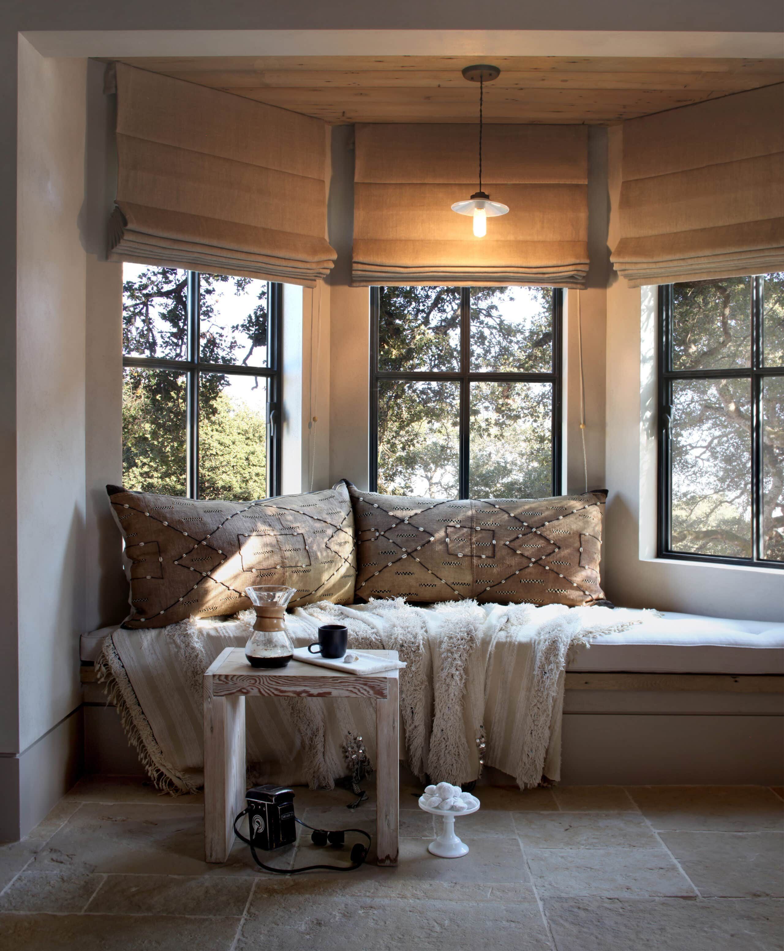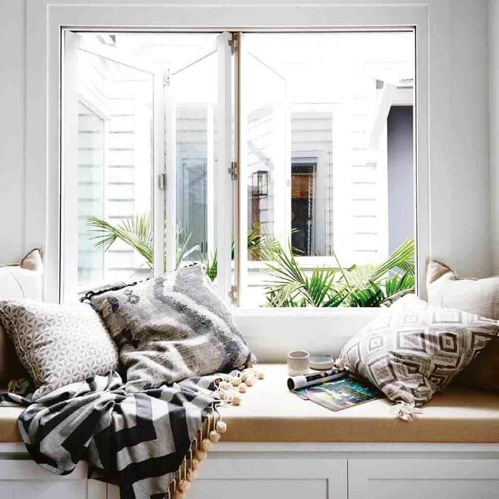 Accessorize with small side tables or an oversized pouf for a bit of contrast. Hang soft curtains to frame the view, and add a woven basket nearby to store extra throws. If your window overlooks a less-than-stellar scene, consider adding some pretty, sheer blinds or a vibrant stained glass sticker to transform the view into a work of art.